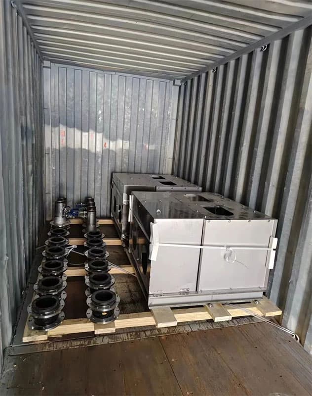 Requisitos de materiales: La carcasa y el marco se construyeron con acero inoxidable SUS304 de 3-5 mm de espesor, y el intercambiador de calor se construyó con acero inoxidable 316L engrosado. Todas las tuberías fueron de acero inoxidable 304. Todos los componentes, como la sala de bombas integrada, también se construyeron con acero inoxidable 304. La barandilla superior de la torre requería una señal de advertencia con patrón de cebra.